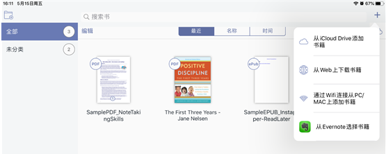 点击APP右上角+号就可以导入文件,里面有4种导入方式可供我们选择,在这里小编推荐大家使用第三种方式,即在电脑将文件下载好,再【通过WiFi连接PC传输来添加书籍】。