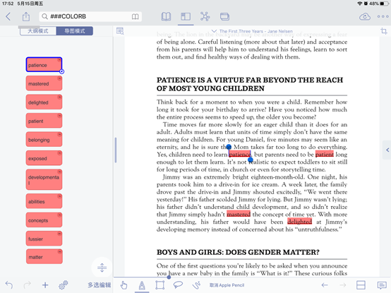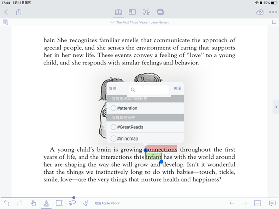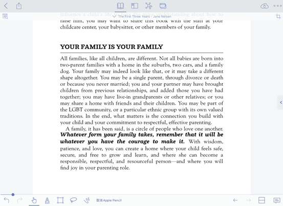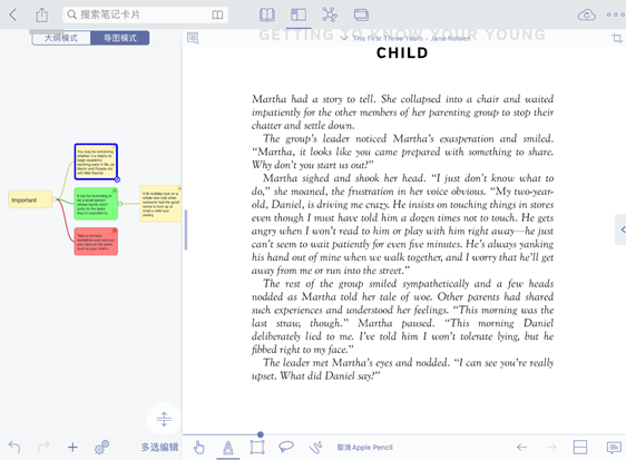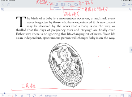 小编这里以The First Three Years这本书的PDF格式为例导入进行阅读学习;首先来认识以下MarginNote基本模式和工具栏吧