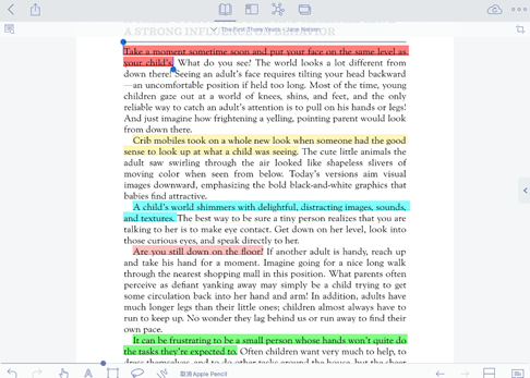 MarginNote 的高亮批注功能足够简洁,划重点时不会像纸书一样容易画乱。点进文章,在下方导航条选中手指的形状,在文字上面滑动就能高亮语句,和用荧光笔一样。