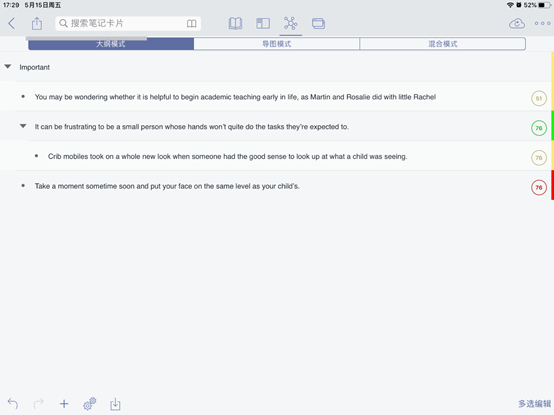 MarginNote还为我们提供了学习卡片的功能,任何一条摘选和笔记都能自动变成学习卡来复习。最后你需要做的只是高亮标注文本,然后选择学习卡模式,用学习卡来巩固知识或背诵单词,我们可以对所有标注的单词、句子进行复习!
