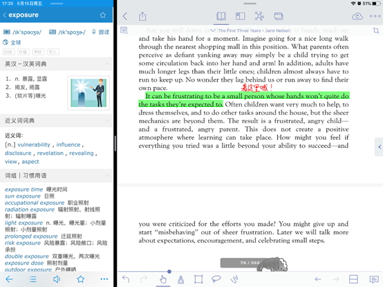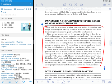 基于APP内嵌查单词功能,app自带相对权威的牛津英汉汉英词典,但是内置词典,中文意思较少,在这里推荐大家用欧路字典进行查阅,我们可以用苹果强大的分屏功能,将欧路词典分到左右两边,以便随时查单词或句子(下面录制视频为大家展示)